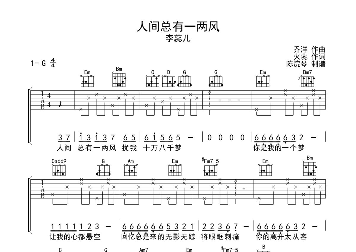 李蕊儿《人间总有一两风》吉他谱 - G调弹唱六线谱
