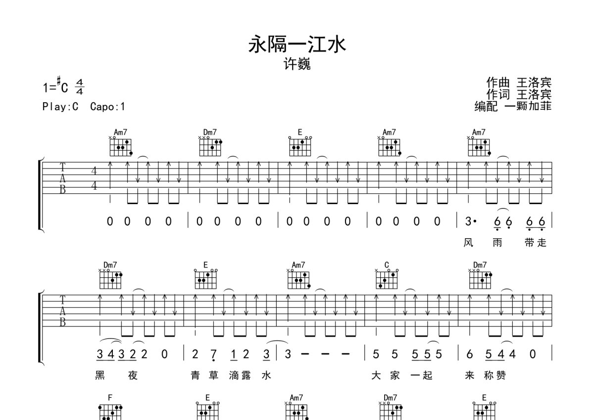 《永隔一江水》是许巍演唱的一首歌曲,简易入门弹唱版,本吉他谱采用的是C调指法编配,这份吉他谱共有三张高清图谱,图谱由 @一颗加菲 编配上传,图谱使用六线谱编配,包含吉他和弦指法、简谱以及歌词部分,曲谱配备了相关的音频提供试听,使用这份永隔一江水吉他谱,可以让你更加方便地掌握这首歌曲的弹唱技巧,快来尝试吧。