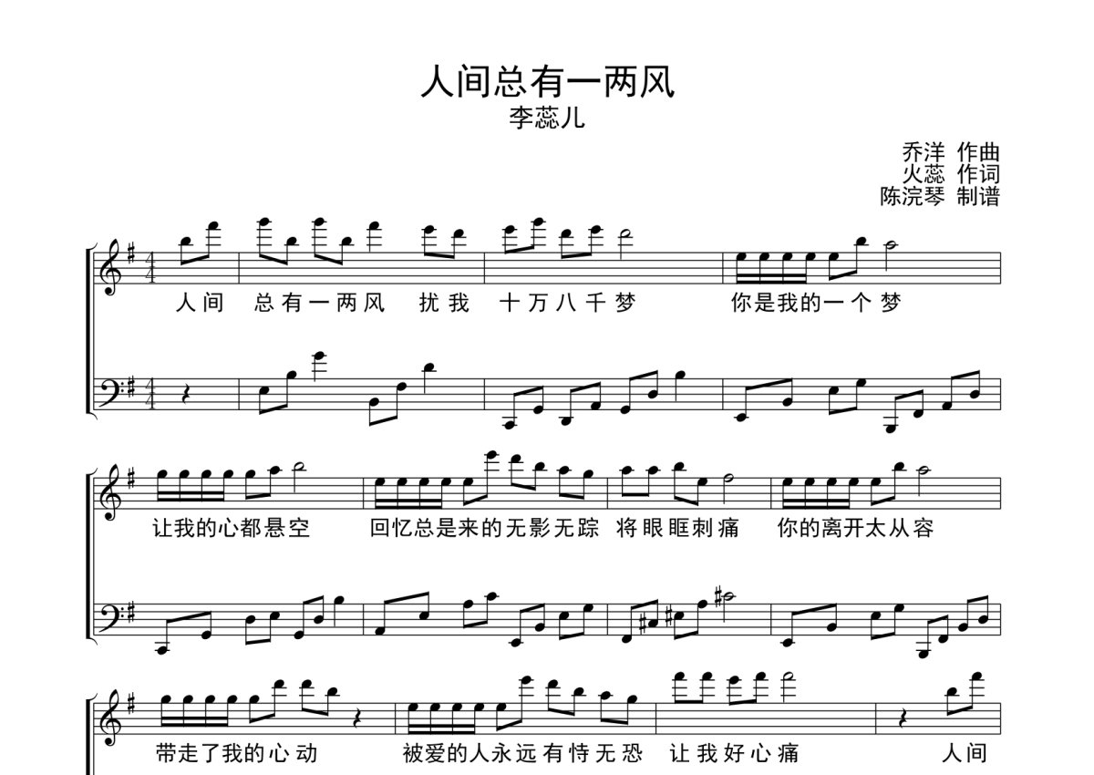 《人间总有一两风》是李蕊儿演唱的一首歌曲,简易版,适合新手练习使用,这份钢琴谱共有两张高清图谱,图谱由 @月隐云先知 编配上传,使用这份人间总有一两风钢琴谱,可以让你更加方便地掌握这首歌曲的演奏技巧,快来尝试吧。李蕊儿《人间总有一两风》钢琴谱,来自@陈浣琴制谱。G调原调钢琴五线谱,为极简版,附歌词,简单好弹,适合初学者练习使用。共两张高清图谱。