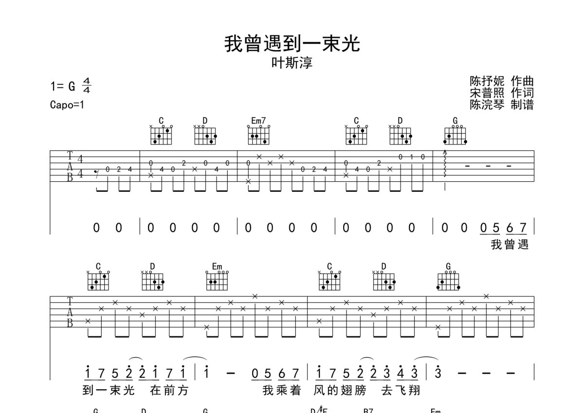 叶斯淳《我曾遇到一束光》吉他谱 - G调弹唱六线谱