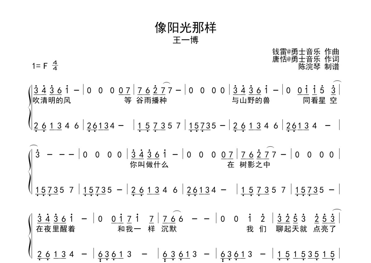 王一博《像阳光那样》钢琴谱