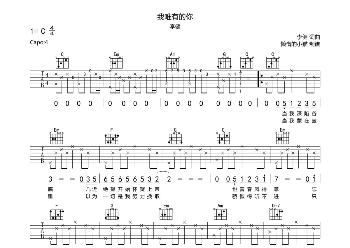 李健《我唯有的你》吉他谱 - C调弹唱六线谱