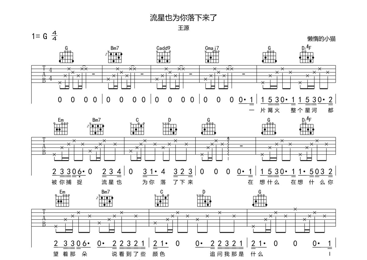 王源《流星也为你落了下来》吉他谱 - G调弹唱六线谱