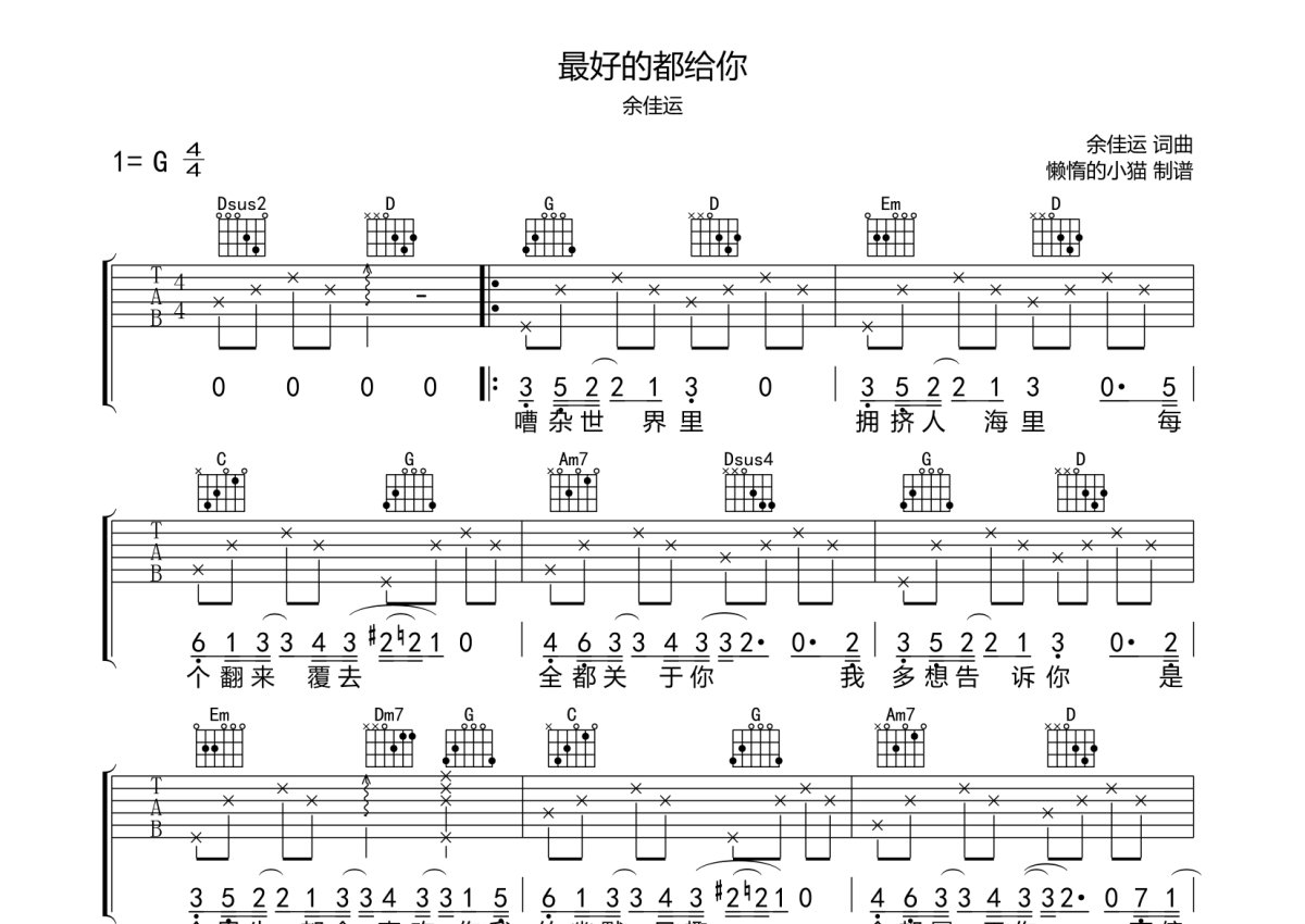 余佳运《最好的都给你》吉他谱 - G调弹唱六线谱
