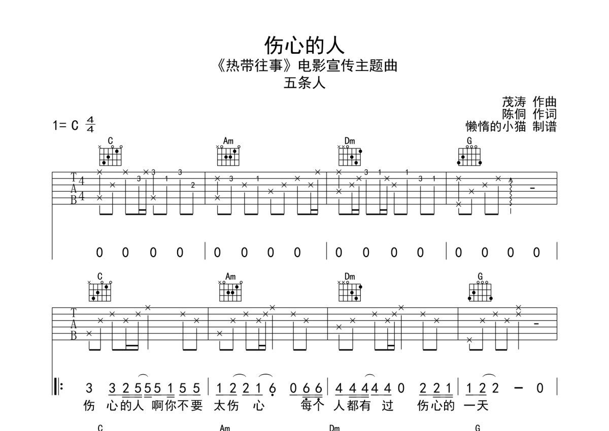 五条人《伤心的人》吉他谱 - C调弹唱六线谱