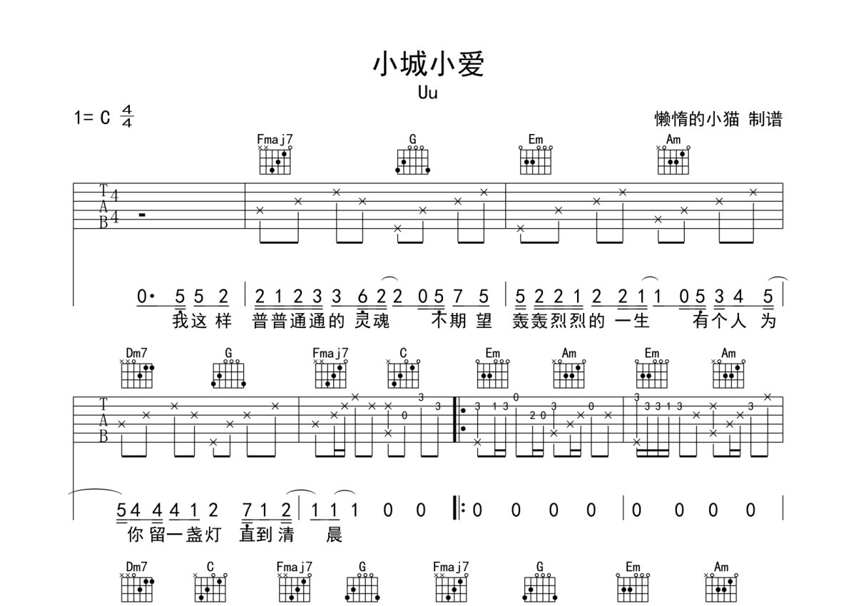Uu《小城小爱》吉他谱 - C调弹唱六线谱
