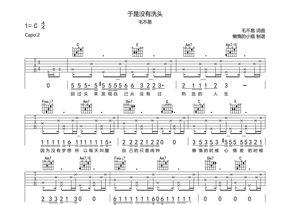 毛不易《于是没有洗头》吉他谱 - C调弹唱六线谱