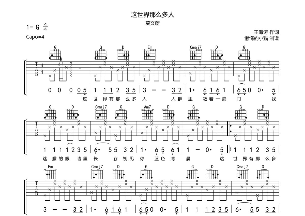 《这世界那么多人》是莫文蔚演唱的一首歌曲,本吉他谱采用的是G调指法编配,这份吉他谱共有两张高清图谱,图谱由 @懒惰的小猫 编配上传,图谱使用六线谱编配,包含吉他和弦指法、简谱以及歌词部分,使用这份这世界那么多人吉他谱,可以让你更加方便地掌握这首歌曲的弹唱技巧,快来尝试吧。莫文蔚《这世界那么多人》吉他谱_G调吉他弹唱谱。