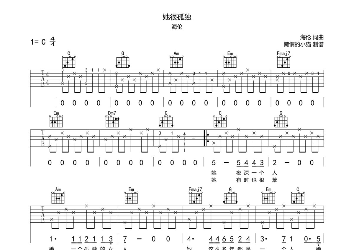 海伦《她很孤独》吉他谱 - C调弹唱六线谱