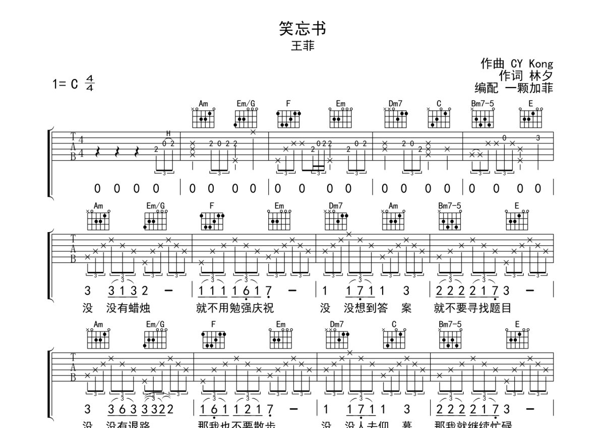 王菲《笑忘书》吉他谱 - C调弹唱六线谱 - 完整编配版