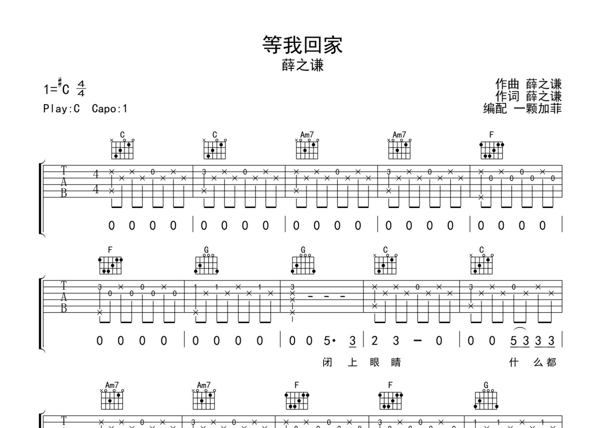 薛之谦《等我回家》吉他谱 - C调弹唱六线谱 - 完整编配版
