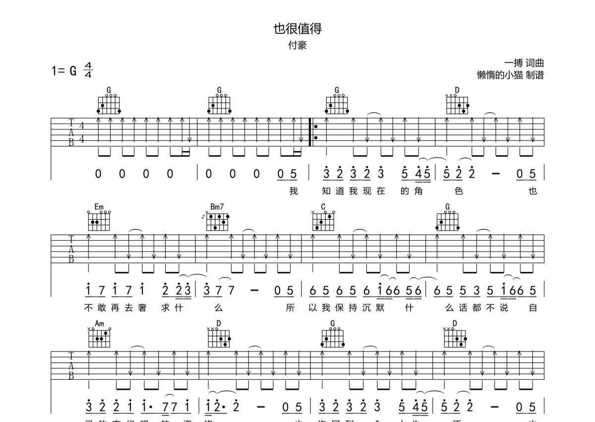付豪《也很值得》吉他谱 - G调弹唱六线谱