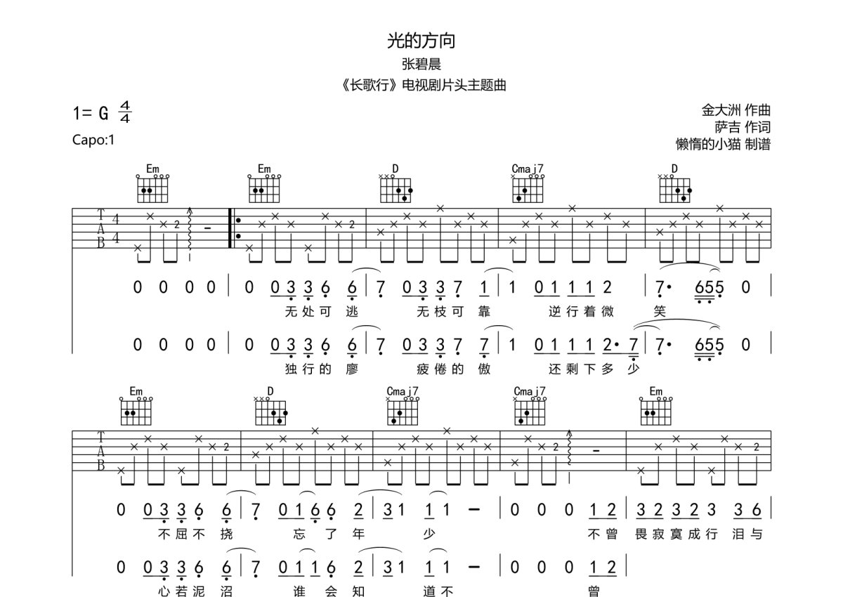 《光的方向》是张碧晨演唱的一首歌曲,本吉他谱采用的是G调指法编配,这份吉他谱共有两张高清图谱,图谱由 @懒惰的小猫 编配上传,图谱使用六线谱编配,包含吉他和弦指法、简谱以及歌词部分,使用这份光的方向吉他谱,可以让你更加方便地掌握这首歌曲的弹唱技巧,快来尝试吧。张碧晨《光的方向》吉他谱_G调吉他弹唱谱。