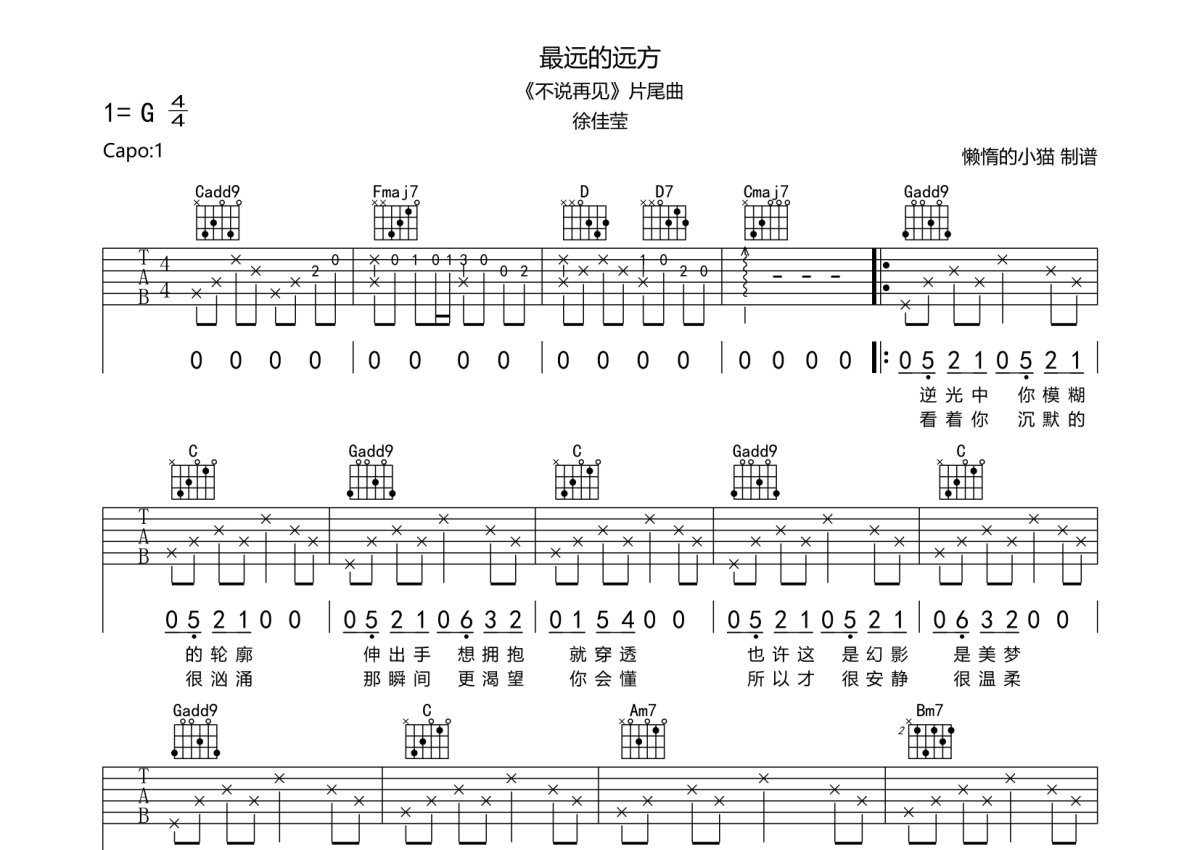 《最远的远方》是徐佳莹演唱的一首歌曲,本吉他谱采用的是G调指法编配,这份吉他谱共有两张高清图谱,图谱由 @懒惰的小猫 编配上传,图谱使用六线谱编配,包含吉他和弦指法、简谱以及歌词部分,使用这份最远的远方吉他谱,可以让你更加方便地掌握这首歌曲的弹唱技巧,快来尝试吧。徐佳莹《最远的远方》吉他谱_G调吉他弹唱谱。