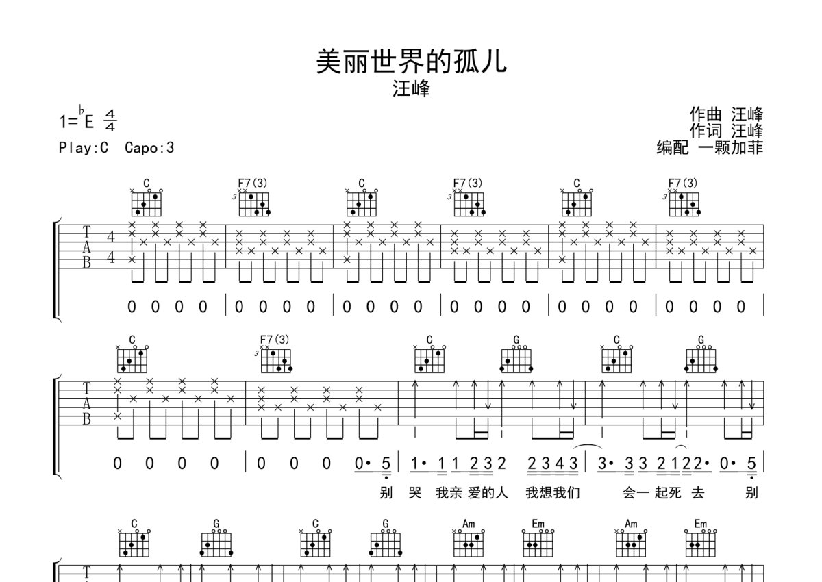 《美丽世界的孤儿》是汪峰演唱的一首歌曲,完整编配版,本吉他谱采用的是C调指法编配,这份吉他谱共有四张高清图谱,图谱由 @一颗加菲 编配上传,图谱使用六线谱编配,包含吉他和弦指法、简谱以及歌词部分,曲谱配备了相关的音频提供试听,使用这份美丽世界的孤儿吉他谱,可以让你更加方便地掌握这首歌曲的弹唱技巧,快来尝试吧。