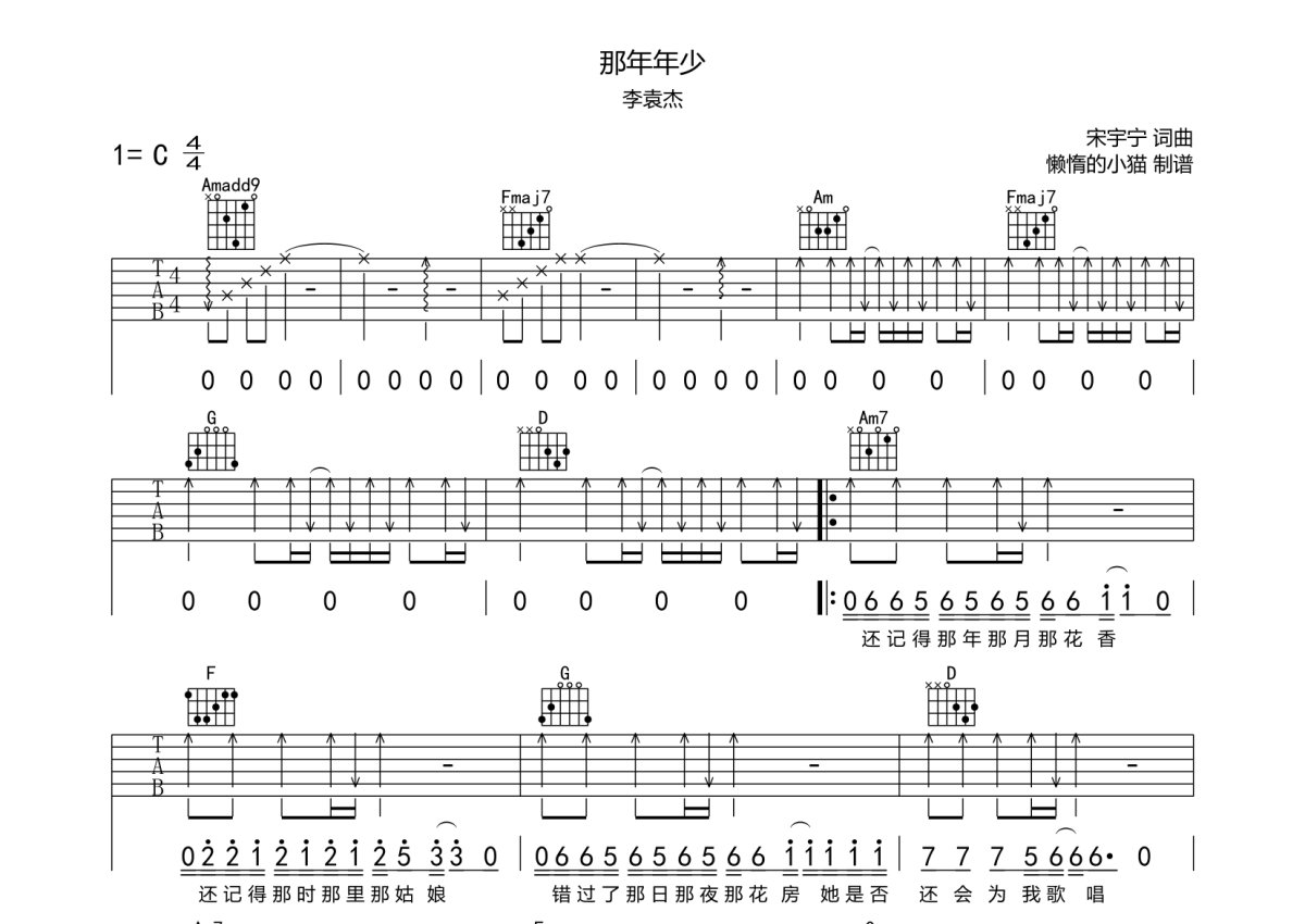 李袁杰《那年年少》吉他谱 - C调弹唱六线谱