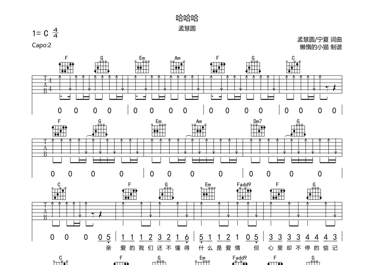 孟慧圆《哈哈哈》吉他谱 - C调弹唱六线谱