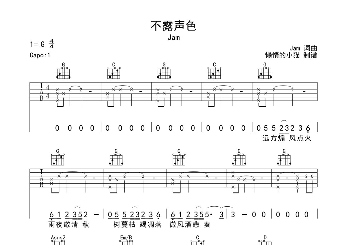 Jam《不露声色》吉他谱 - G调弹唱六线谱