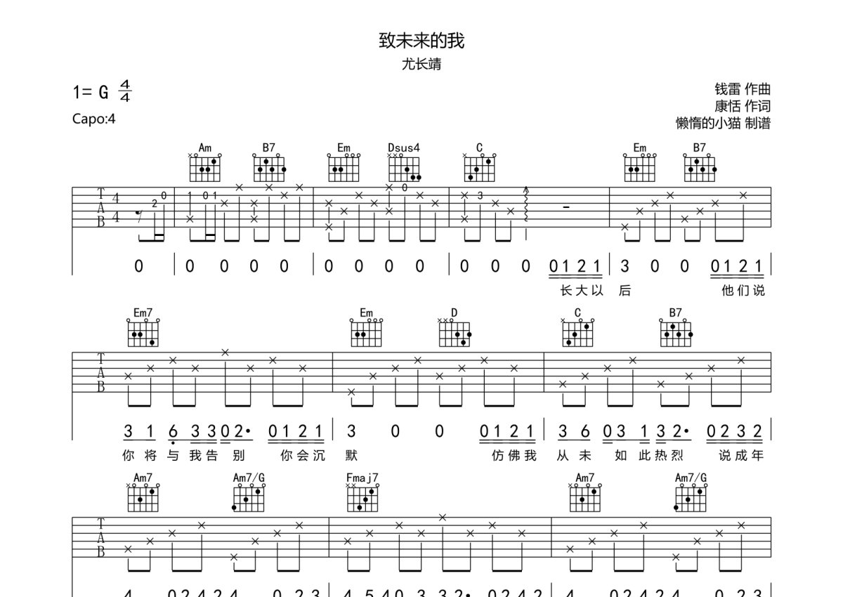 尤长靖《致未来的我》吉他谱 - G调弹唱六线谱