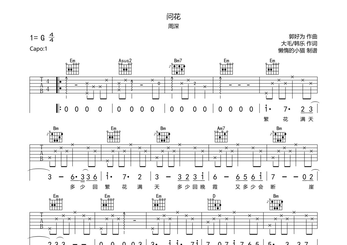 周深《问花》吉他谱 - G调弹唱六线谱