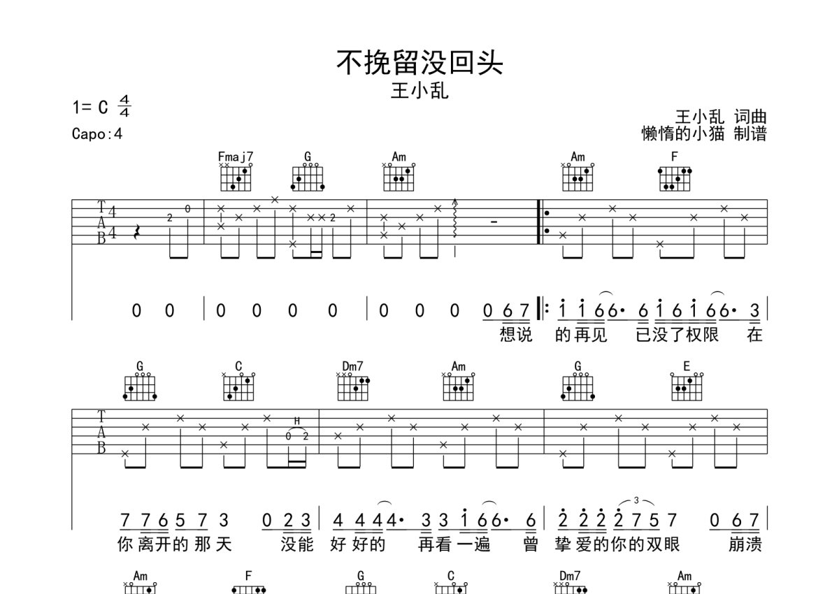 王小乱《不挽留没回头》吉他谱 - C调弹唱六线谱