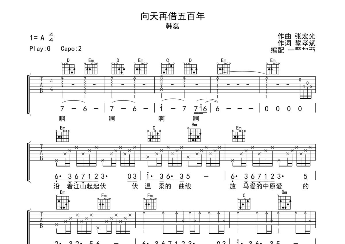 《向天再借五百年》是韩磊演唱的一首歌曲,完整编配版,本吉他谱采用的是G调指法编配,这份吉他谱共有两张高清图谱,图谱由 @一颗加菲 编配上传,图谱使用六线谱编配,包含吉他和弦指法、简谱以及歌词部分,曲谱配备了相关的音频提供试听,使用这份向天再借五百年吉他谱,可以让你更加方便地掌握这首歌曲的弹唱技巧,快来尝试吧。