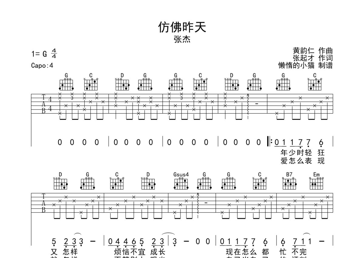 张杰《仿佛昨天》吉他谱 - G调弹唱六线谱