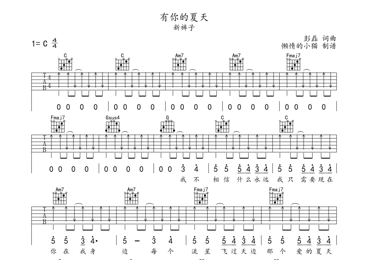 新裤子《有你的夏天》吉他谱 - C调弹唱六线谱