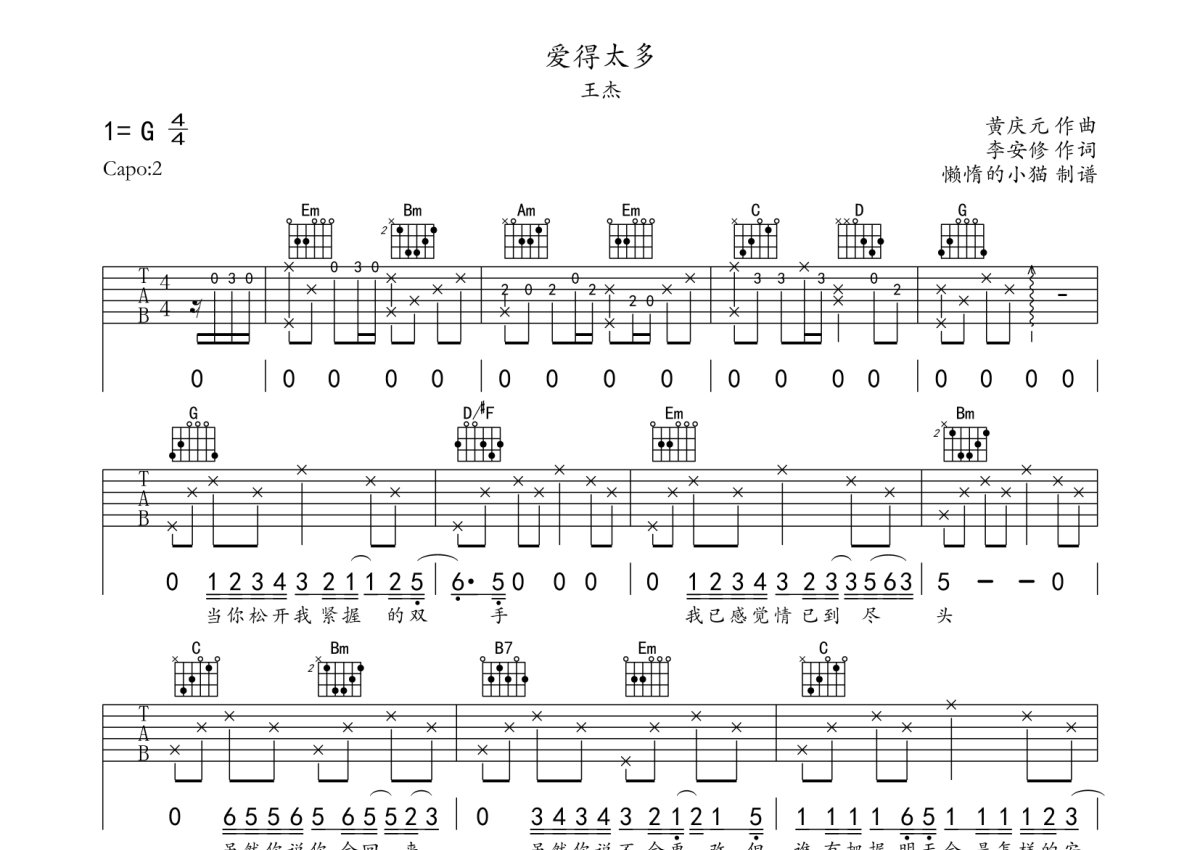 《爱得太多》是王杰演唱的一首歌曲,本吉他谱采用的是G调指法编配,这份吉他谱共有三张高清图谱,图谱由 @懒惰的小猫 编配上传,图谱使用六线谱编配,包含吉他和弦指法、简谱以及歌词部分,使用这份爱得太多吉他谱,可以让你更加方便地掌握这首歌曲的弹唱技巧,快来尝试吧。王杰《爱得太多》吉他谱_G调吉他弹唱谱。