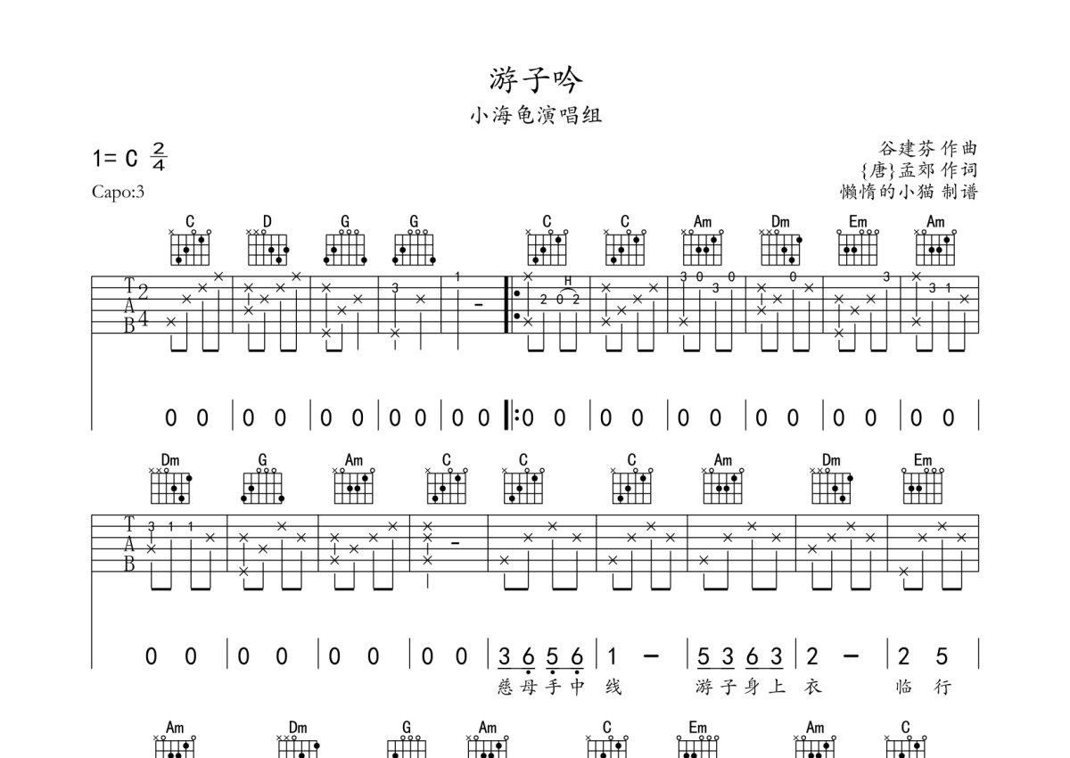 小海龟演唱组《游子吟》吉他谱 - C调弹唱六线谱