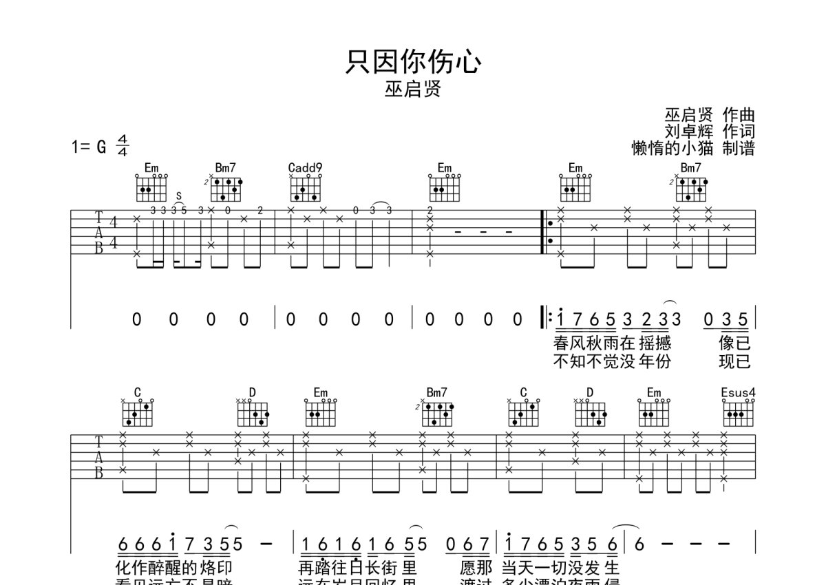 巫启贤《只因你伤心》吉他谱 - G调弹唱六线谱