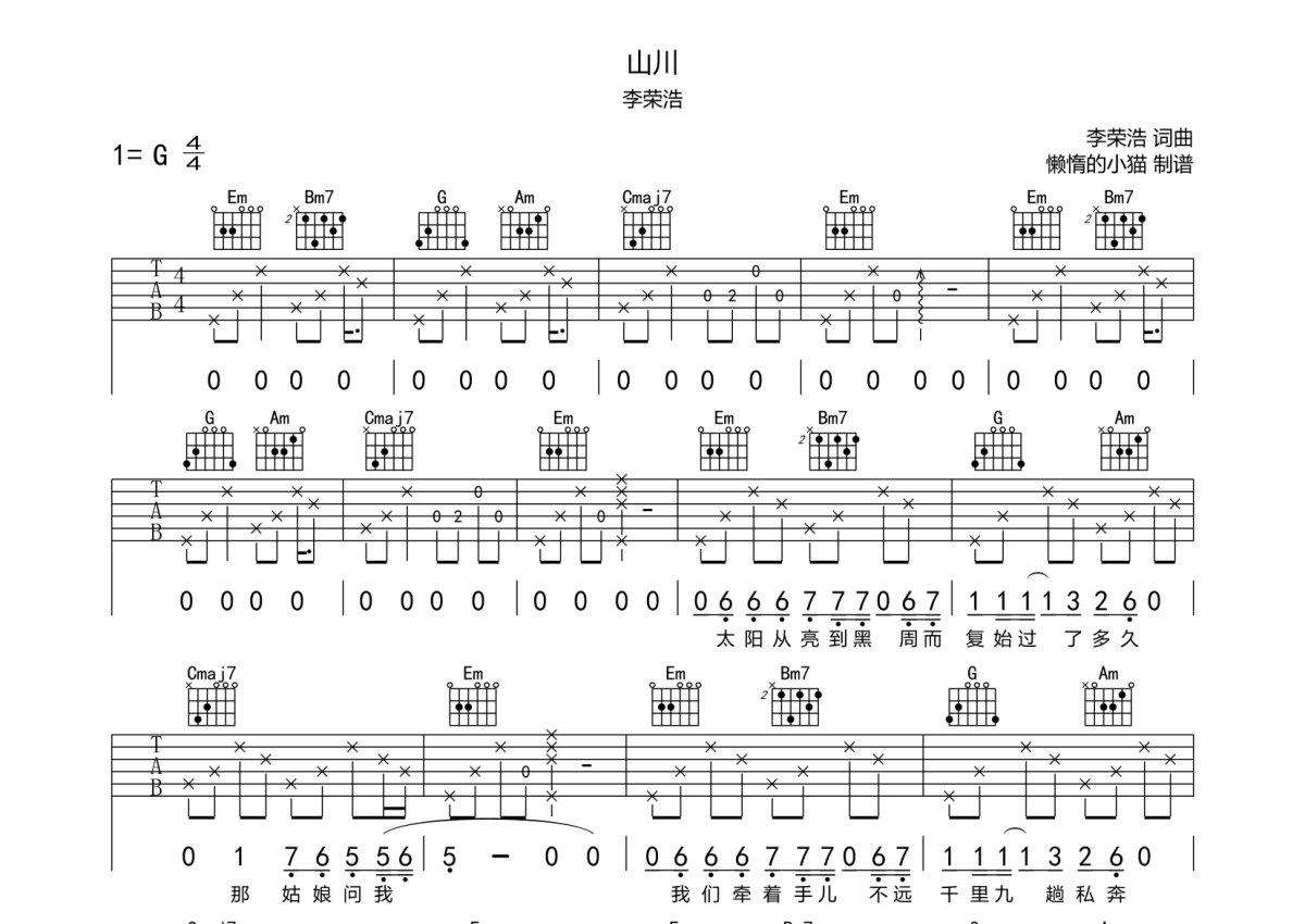 李荣浩《山川》吉他谱 - G调弹唱六线谱