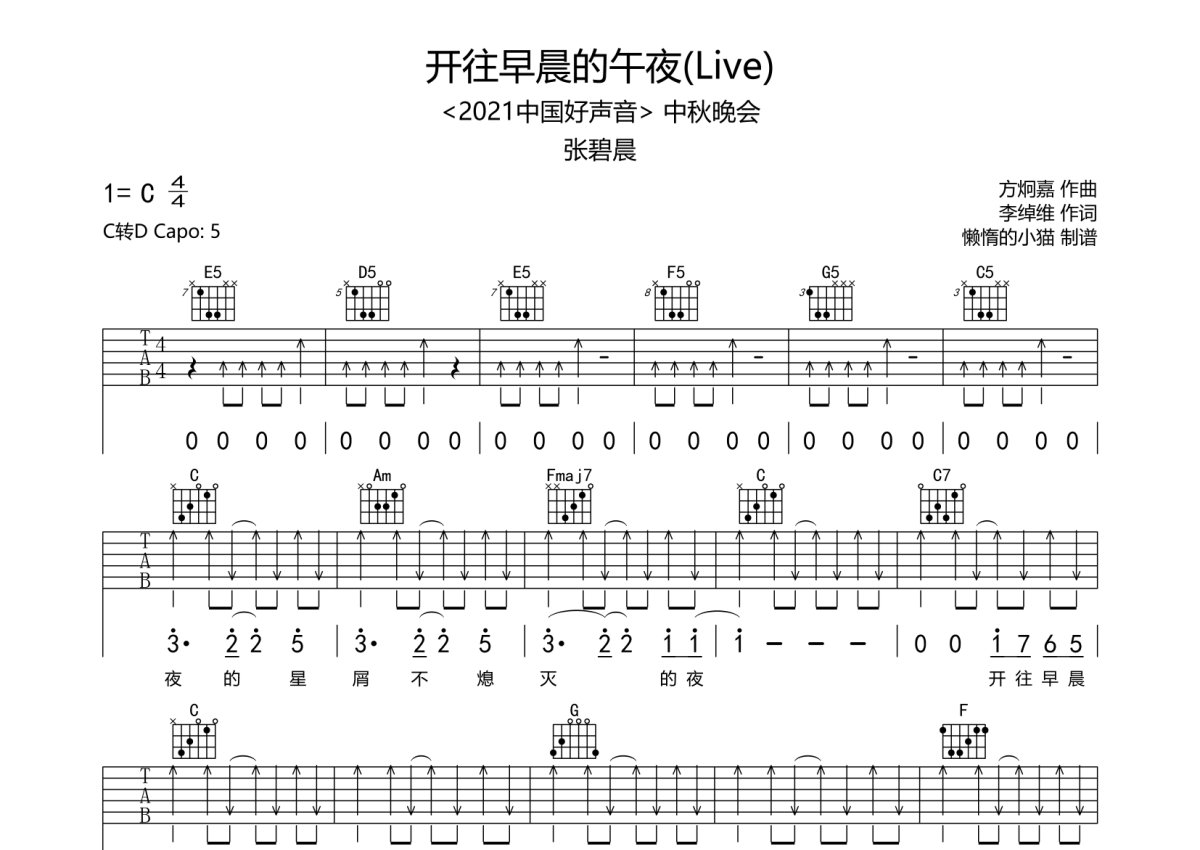 张碧晨《开往早晨的午夜》吉他谱 - C调弹唱六线谱