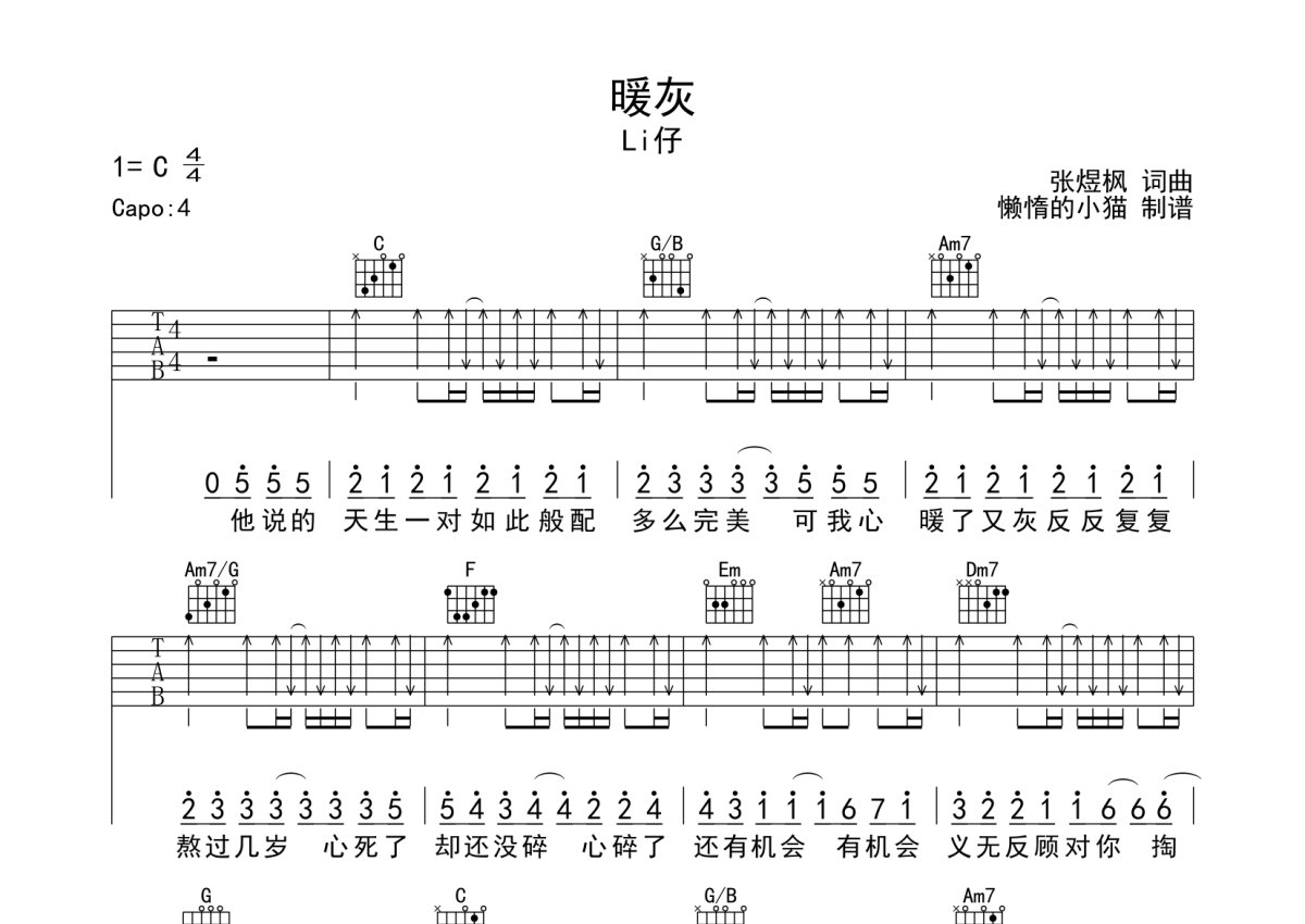 Li仔《暖灰》吉他谱 - C调弹唱六线谱
