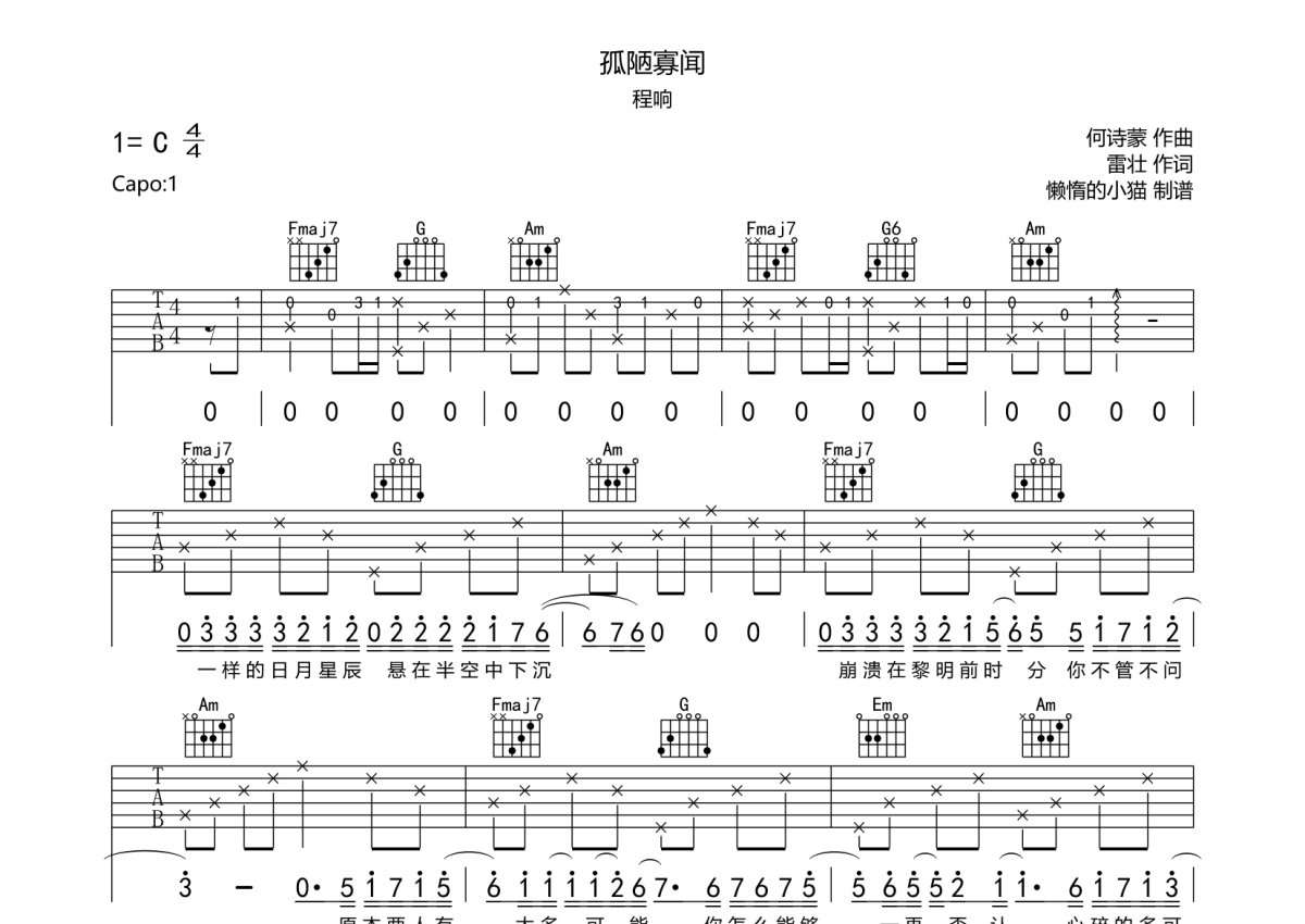 《孤陋寡闻》是程响演唱的一首歌曲,本吉他谱采用的是C调指法编配,这份吉他谱共有三张高清图谱,图谱由 @懒惰的小猫 编配上传,图谱使用六线谱编配,包含吉他和弦指法、简谱以及歌词部分,使用这份孤陋寡闻吉他谱,可以让你更加方便地掌握这首歌曲的弹唱技巧,快来尝试吧。程响《孤陋寡闻》吉他谱_C调吉他弹唱谱。