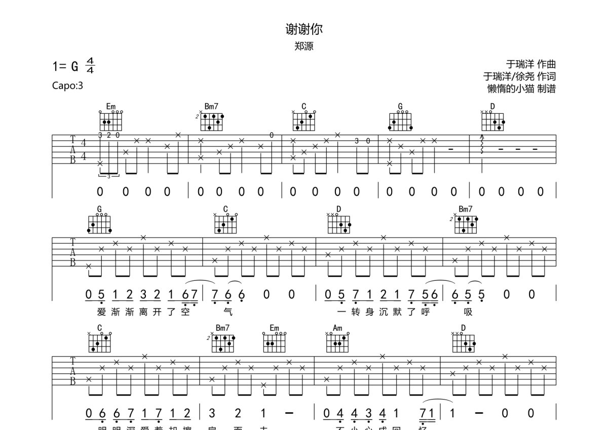 《谢谢你》是郑源演唱的一首歌曲,本吉他谱采用的是G调指法编配,这份吉他谱共有三张高清图谱,图谱由 @懒惰的小猫 编配上传,图谱使用六线谱编配,包含吉他和弦指法、简谱以及歌词部分,使用这份谢谢你吉他谱,可以让你更加方便地掌握这首歌曲的弹唱技巧,快来尝试吧。郑源《谢谢你》吉他谱_G调吉他弹唱谱。