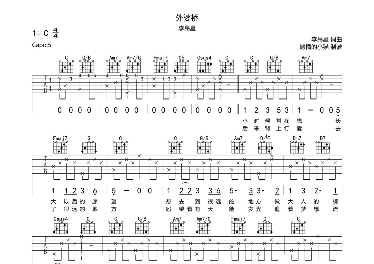 《外婆桥》是李昂星演唱的一首歌曲,本吉他谱采用的是C调指法编配,这份吉他谱共有三张高清图谱,图谱由 @懒惰的小猫 编配上传,图谱使用六线谱编配,包含吉他和弦指法、简谱以及歌词部分,使用这份外婆桥吉他谱,可以让你更加方便地掌握这首歌曲的弹唱技巧,快来尝试吧。李昂星《外婆桥》吉他谱_C调吉他弹唱谱。