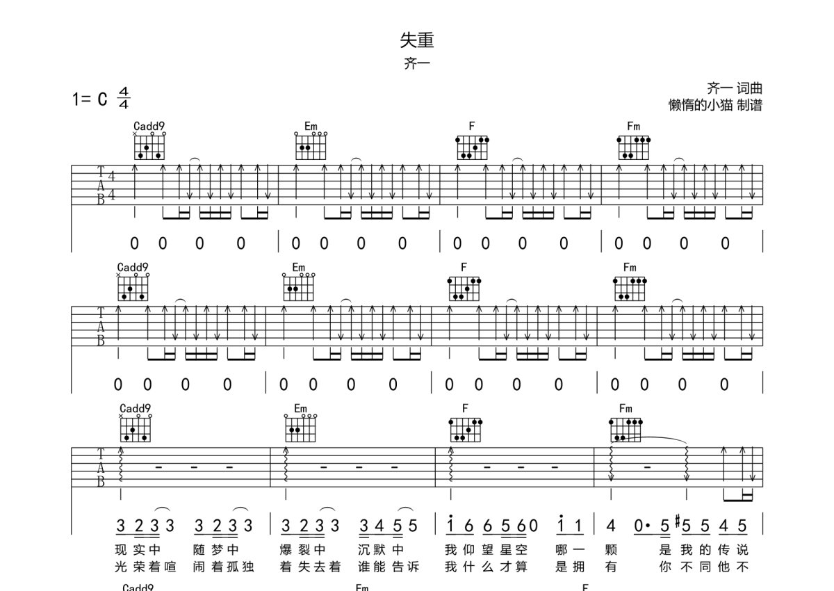 齐一《失重》吉他谱 - C调弹唱六线谱