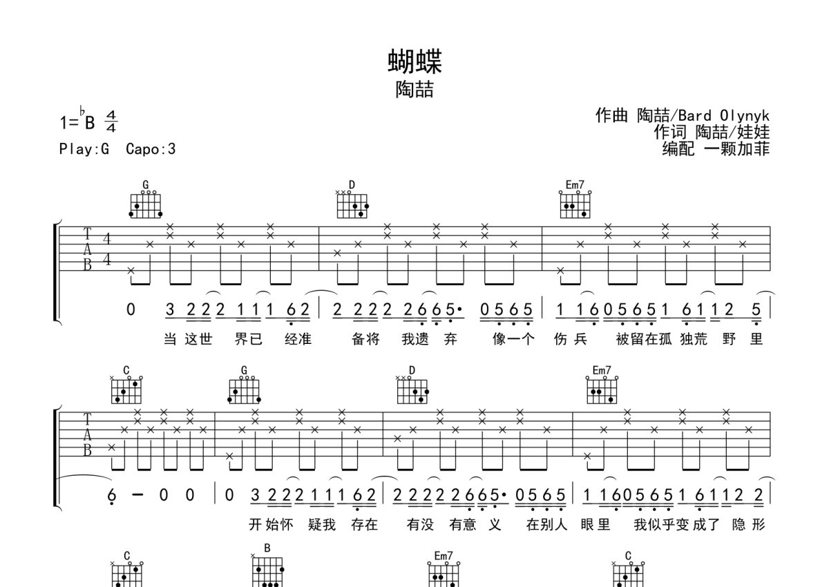 《蝴蝶》是陶喆演唱的一首歌曲,完整编配版,本吉他谱采用的是G调指法编配,这份吉他谱共有四张高清图谱,图谱由 @一颗加菲 编配上传,图谱使用六线谱编配,包含吉他和弦指法、简谱以及歌词部分,曲谱配备了相关的音频提供试听,使用这份蝴蝶吉他谱,可以让你更加方便地掌握这首歌曲的弹唱技巧,快来尝试吧。