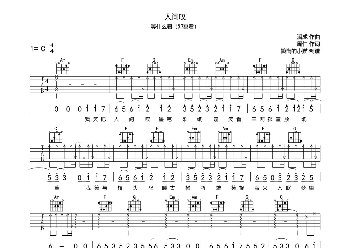 等什么君(邓寓君)《人间叹》吉他谱 - C调弹唱六线谱