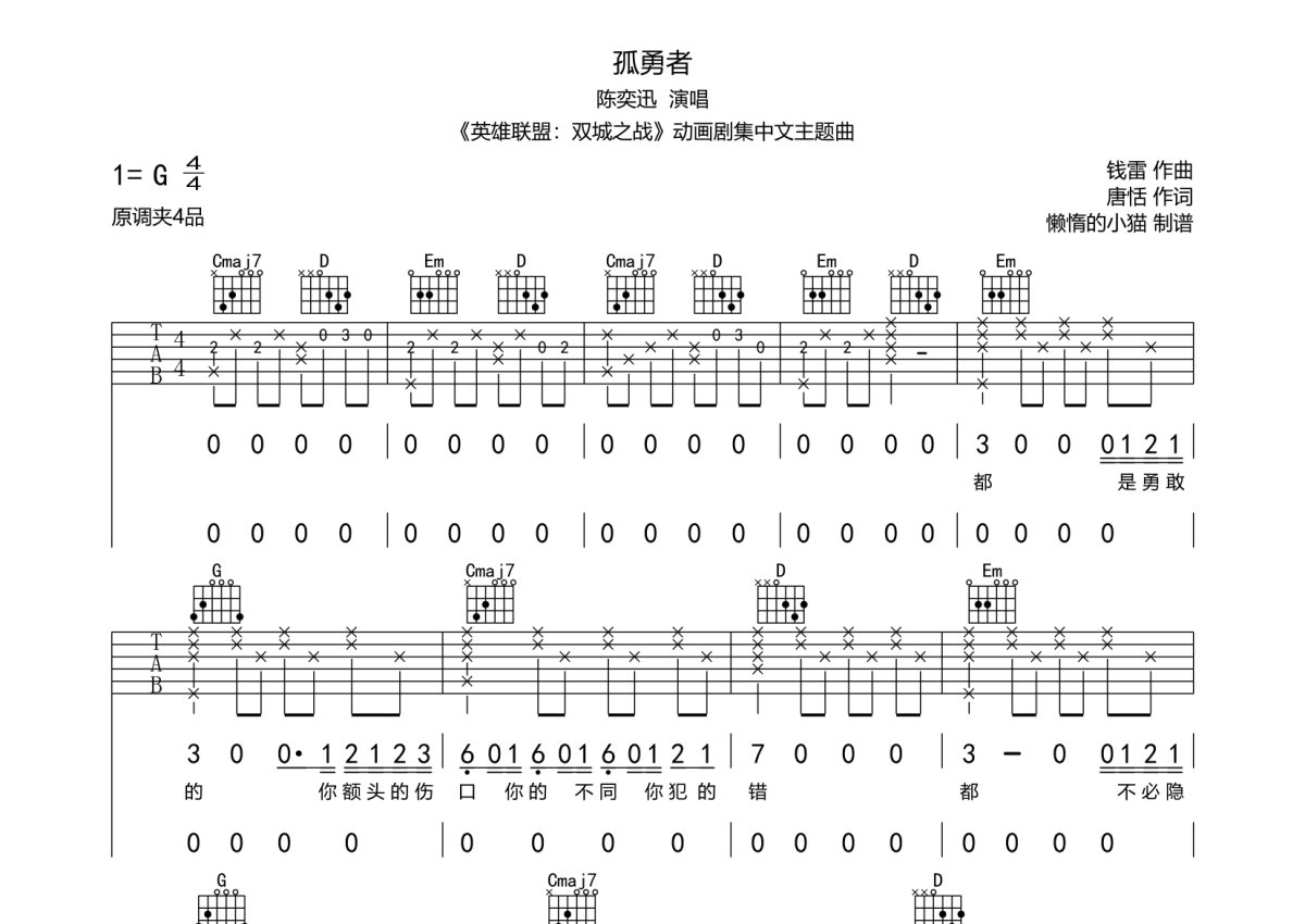陈奕迅《孤勇者》吉他谱 - G调弹唱六线谱