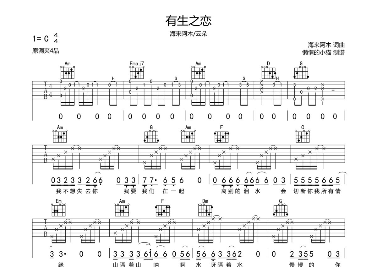 海来阿木《有生之恋》吉他谱 - C调弹唱六线谱
