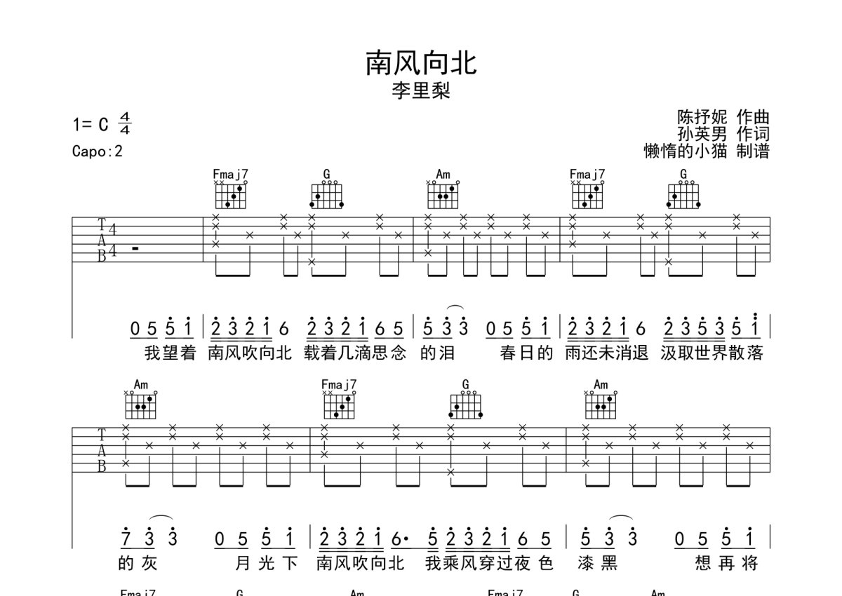 李里梨《南风向北》吉他谱 - C调弹唱六线谱