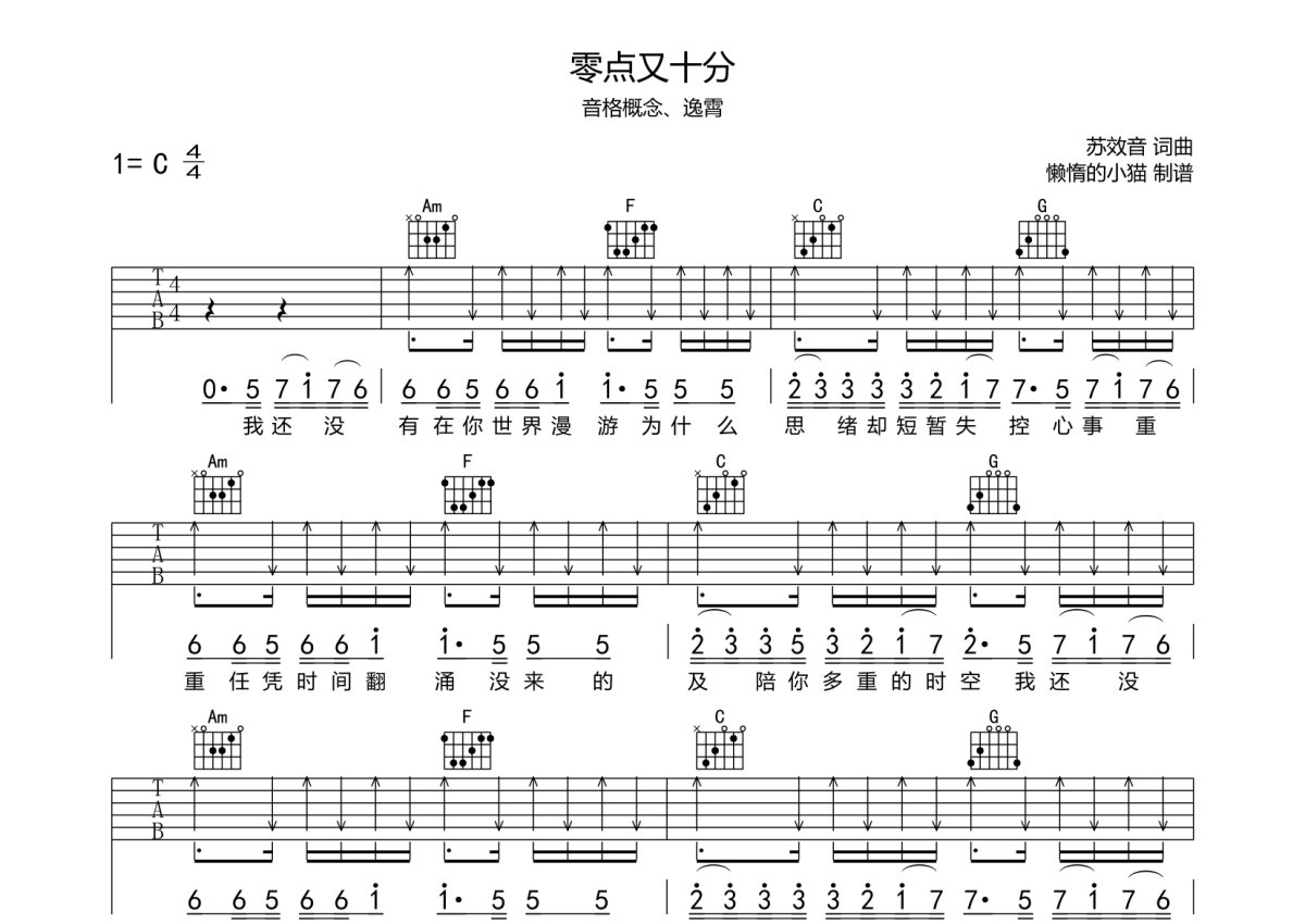 音格概念/逸霄《零点又十分》吉他谱 - C调弹唱六线谱
