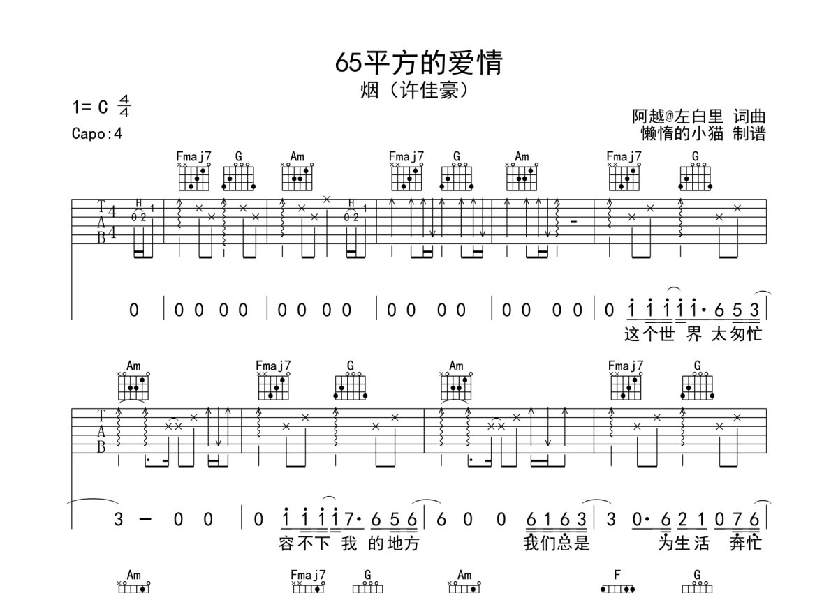 烟(许佳豪)《65平方的爱情》吉他谱 - C调弹唱六线谱