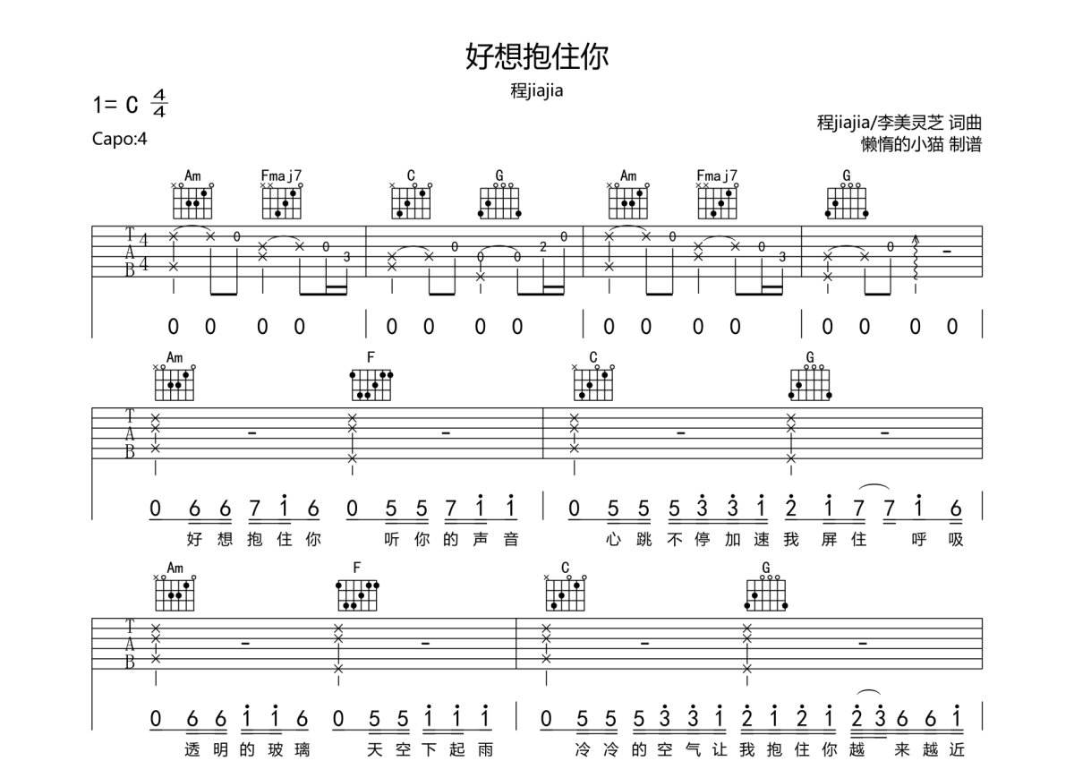 程jiajia《好想抱住你》吉他谱 - C调弹唱六线谱