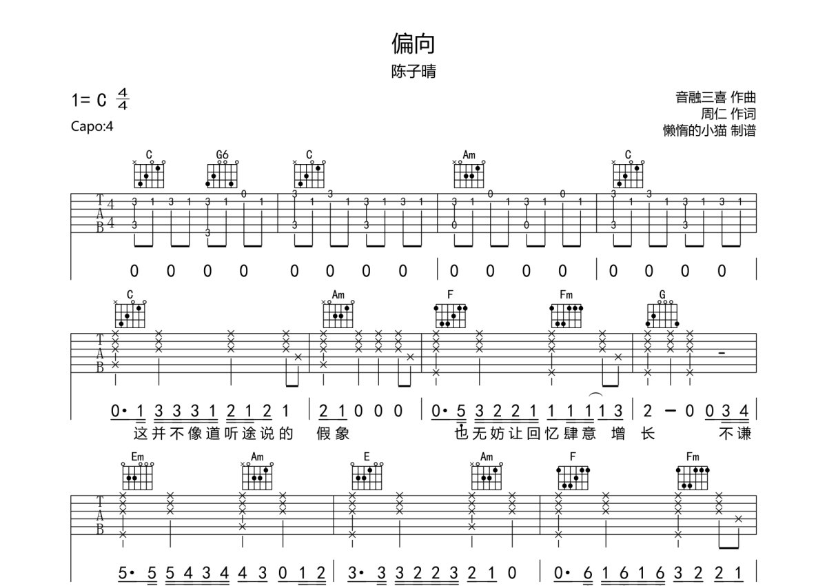 陈子晴《偏向》吉他谱 - C调弹唱六线谱