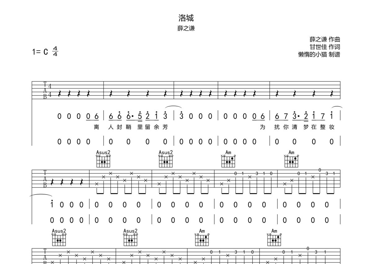 薛之谦《洛城》吉他谱 - C调弹唱六线谱