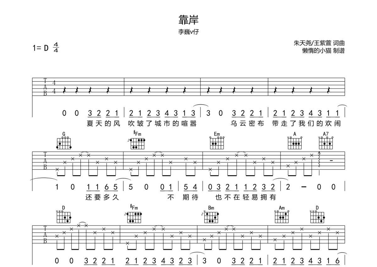 李巍V仔《靠岸》吉他谱 - D调弹唱六线谱