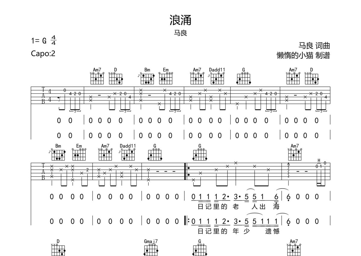 马良《浪涌》吉他谱 - G调弹唱六线谱